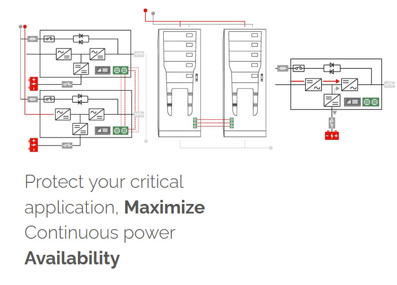 Some UPS architectures still use centralized critical components like a Single Bypass Architecture (SBA). Centralized components in a parallel system represent single points of failure. Unlike the centralized architectures, Centiel’s modular UPS, CumulusPower, is equipped with a Distributed Bypass Architecture (DBA), that brings full redundancy even in the bypass line, avoiding any system’ single point of failure.