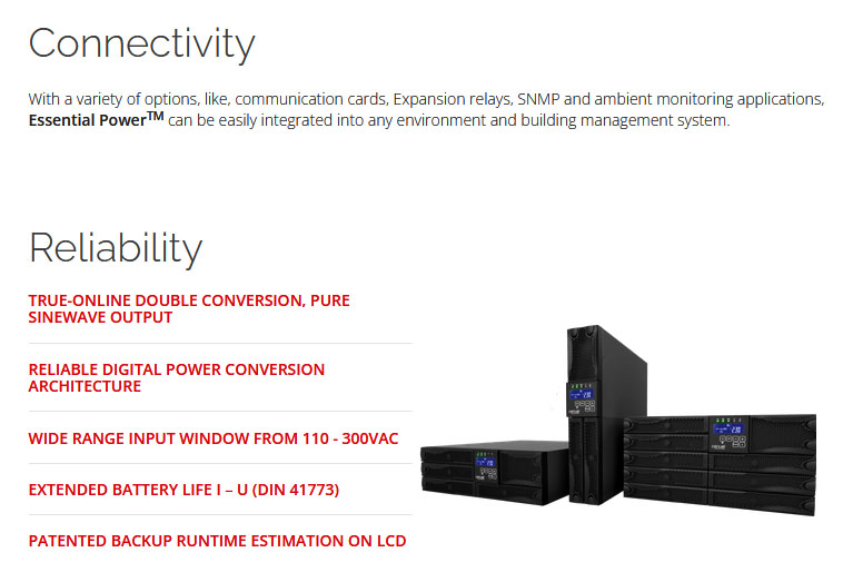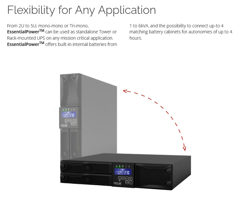 From 1 to 20 kVA, EssentialPower provides the most flexible and reliable solution ideal for small network devices, servers, point-of-sale, work station clusters and light-industrial installations. EssentialPower satisfies any entry-level mission critical application demanding high availability and flexibility.