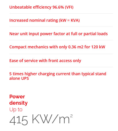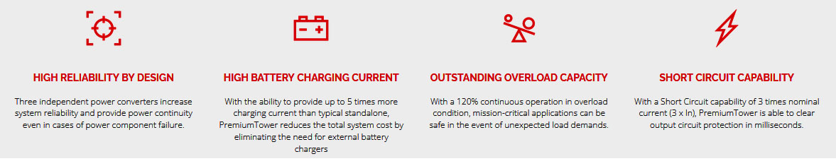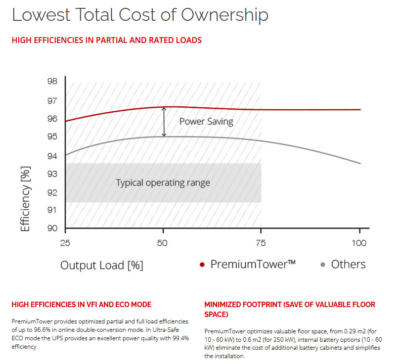 From 10 to 250 kW, PremiumTowerâ„¢ is a Swiss made three-phase, online double-conversion Uninterruptible Power Supply. Configurable as a standalone UPS or as a parallel multi-cabinet system, PremiumTower provides the ultimate flexibility for future growth. PremiumTower offers scalability of up to 7.5 MW and delivers unbeatable energy efficiency in a robust and compact design.