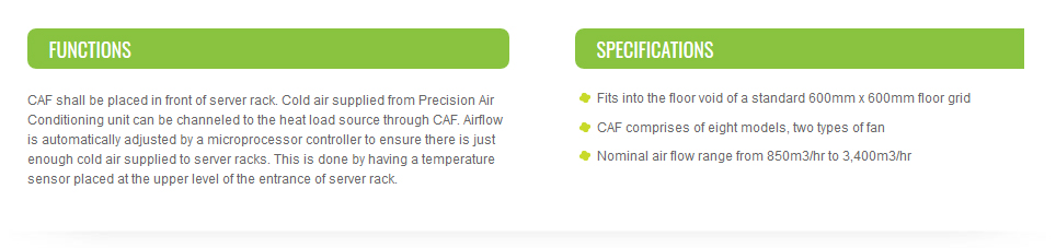 The CITEC Assist Flow (CAF) is designed to improve airflow in data centers. As the heat density of server racks in modern data centers continue to grow, the application of standard Precision Air Conditioning units alone have become insufficient to cater to this need.