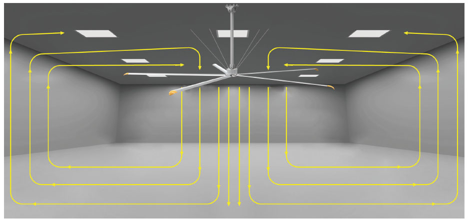 HVLS Fan has combined the physics of slow-moving air with complex principles of aerodynamics to create an efficient, economical and environment friendly solution for large spaces. High Volume Low Speed fans move large volumes of air at low speeds over very large areas. The fan blades produce a massive column of air that flows down to the floor and outward in all directions, creating a deep “horizontal floor jet” that ultimately circulates air up vertically and gets drawn back through the top of the fan. The result is more consistent temperature control, improved airflow/circulation and improved energy efficiency. In cooler months, the HVLS fan operates in reverse, circulating hot air trapped at ceiling level and creating a warmer and consistent mix of air throughout the facility.
