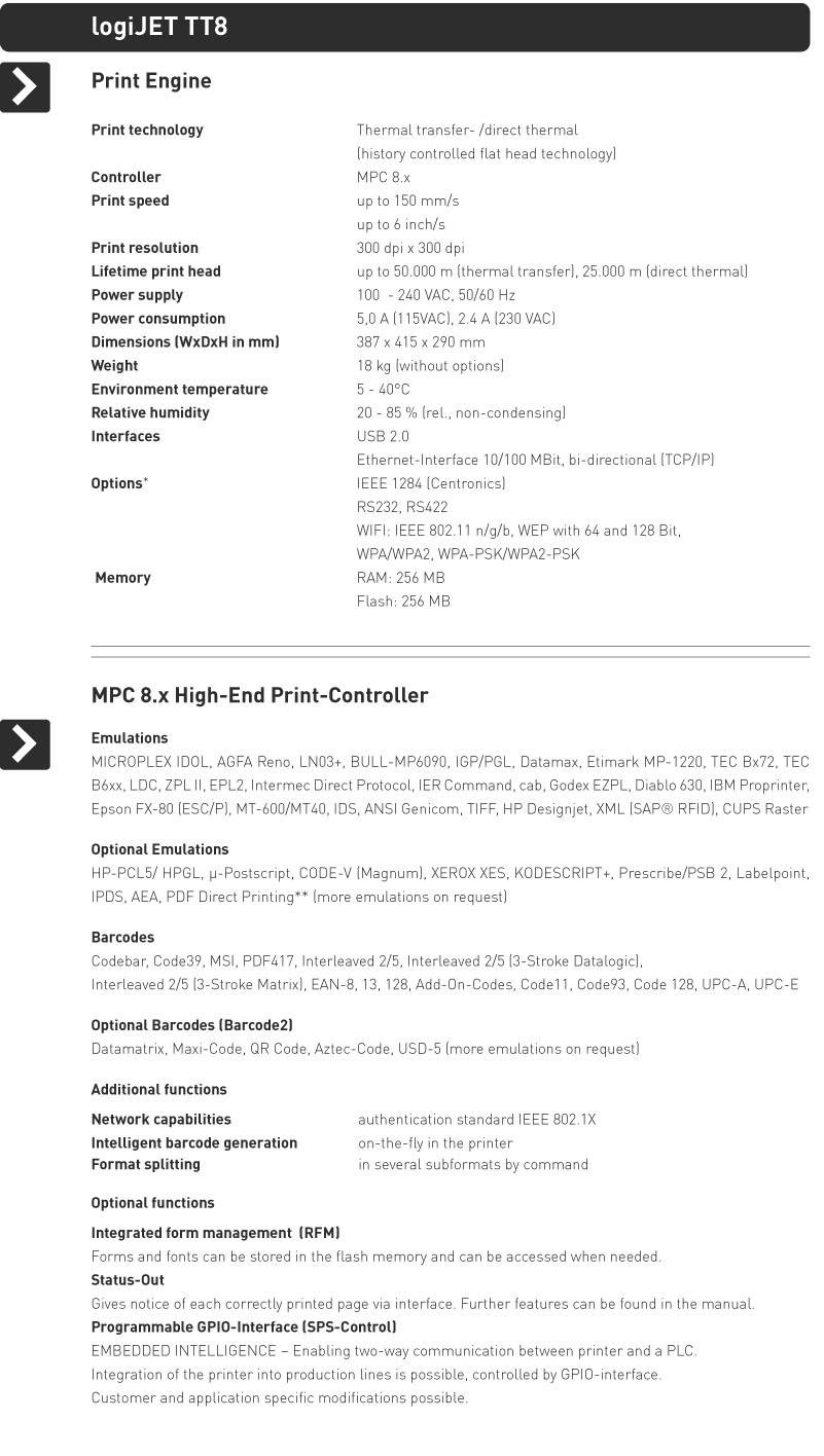 Thanks to the optional cutter, different formats can be printed and cut alternately in a single operation. For perfect integration the logiJET TT8 can be connected directly to hosts like AS/400, iSeries servers or various print managers like InfoPrint® Manager. Among many other printer languages (emulations), PCL5 , IPDS, Kyocera Prescribe and PDF® Direct Printing are supported. In addition, the logiJET TT8 can be used in a highly flexible manner via WIFI, LAN, IEEE 1284, serial or USB if desired.