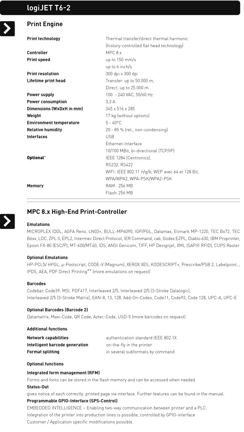 The optional GPIO interface facilitates integration into logistics systems. Optional add-on modules such as cutter, peel and present make the logiJET T6-2 flexible in use. With the optional RFID functionality, UHF RFID inlays can be encoded at the same time as printing.