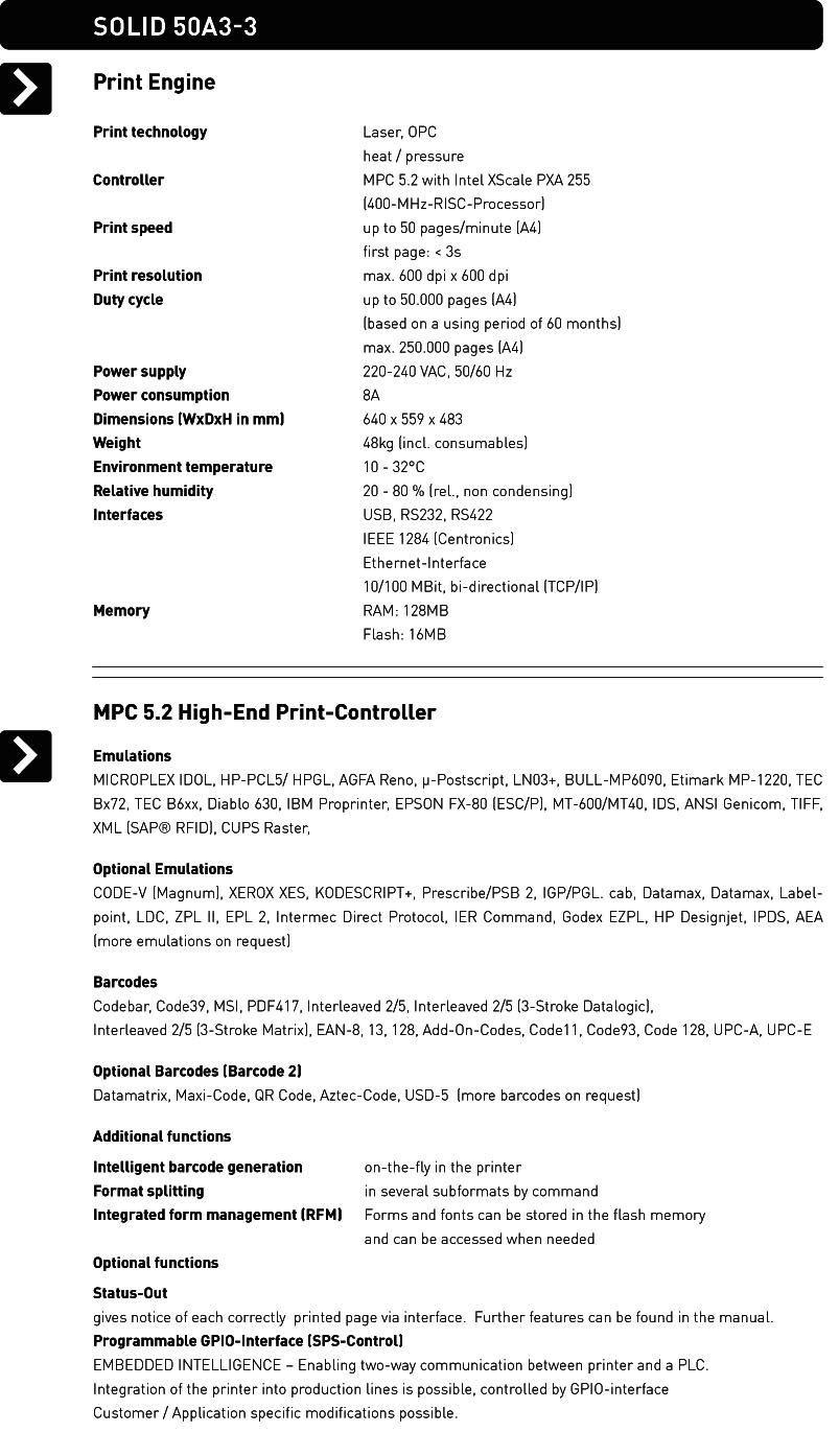 As standard, the SOLID 50A3-3 is equipped with two adjustable 500-sheet paper trays and a multi-purpose feeder as well as a duplex unit for automatic front and back printing (duplex). The face-up tray and GPIO/SPS control option provide optimal conditions for integrating the SOLID 50A3-3 into production lines, order picking and logistics systems.