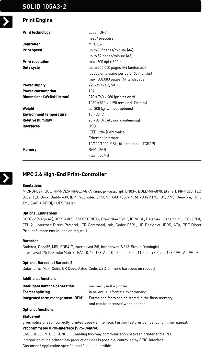 With the more than 40 available printer languages (emulations) of the intelligent Microplex controller, including PCL5, PDF® Direct Printing , IPDS, etc., you can conveniently integrate the SOLID 105A3-2 into your software environment without time-consuming adjustments.