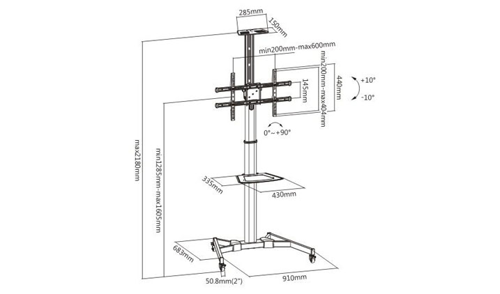 This premium rolling cart has the ability to move your TV or monitor to any room in your home or office. This unit is designed to universally fit most LED, LCD, Plasma TVs and other flat panel displays from 37”-70”. Constructed from commercial-grade, heavy-duty steel, this rolling mount is rated with a capacity up to 110 pounds. A convenient, height adjustable component shelf is made to hold a cable box, game console, DVD player, or any other similar device under 11 pounds. This movable cart is loaded with safety features. The four wheels are heavy-duty casters that roll smoothly. Convenient openings in the upright poles and back plate provide space to pass cables and wires through for a clean and uncluttered look.
